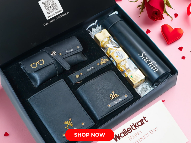 Valentine Love Box For Boyfriend Husband – Personalised Men's Wallet, Passport Cover, Eyewear Case, Keychain, Teddy, Rose & Chocolates