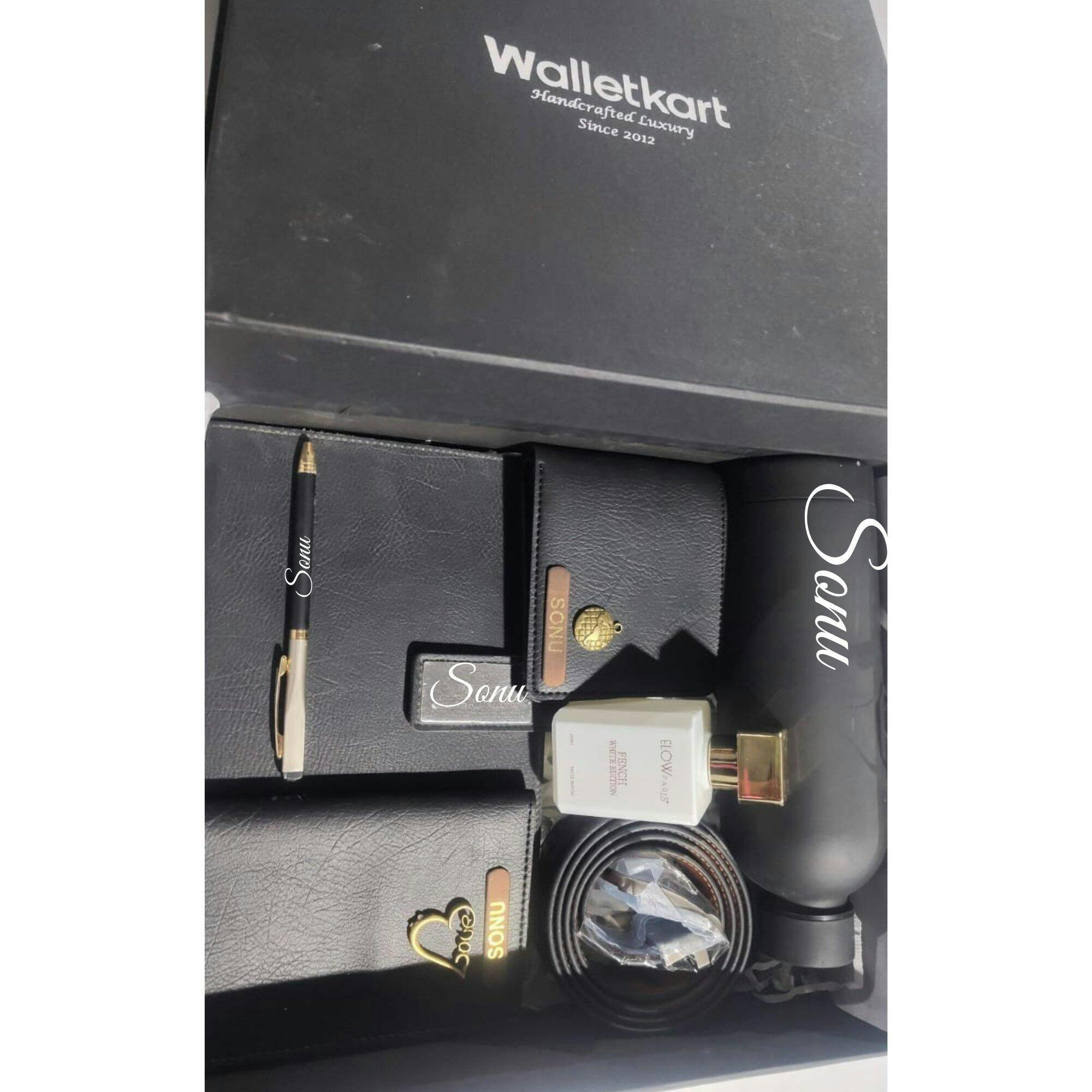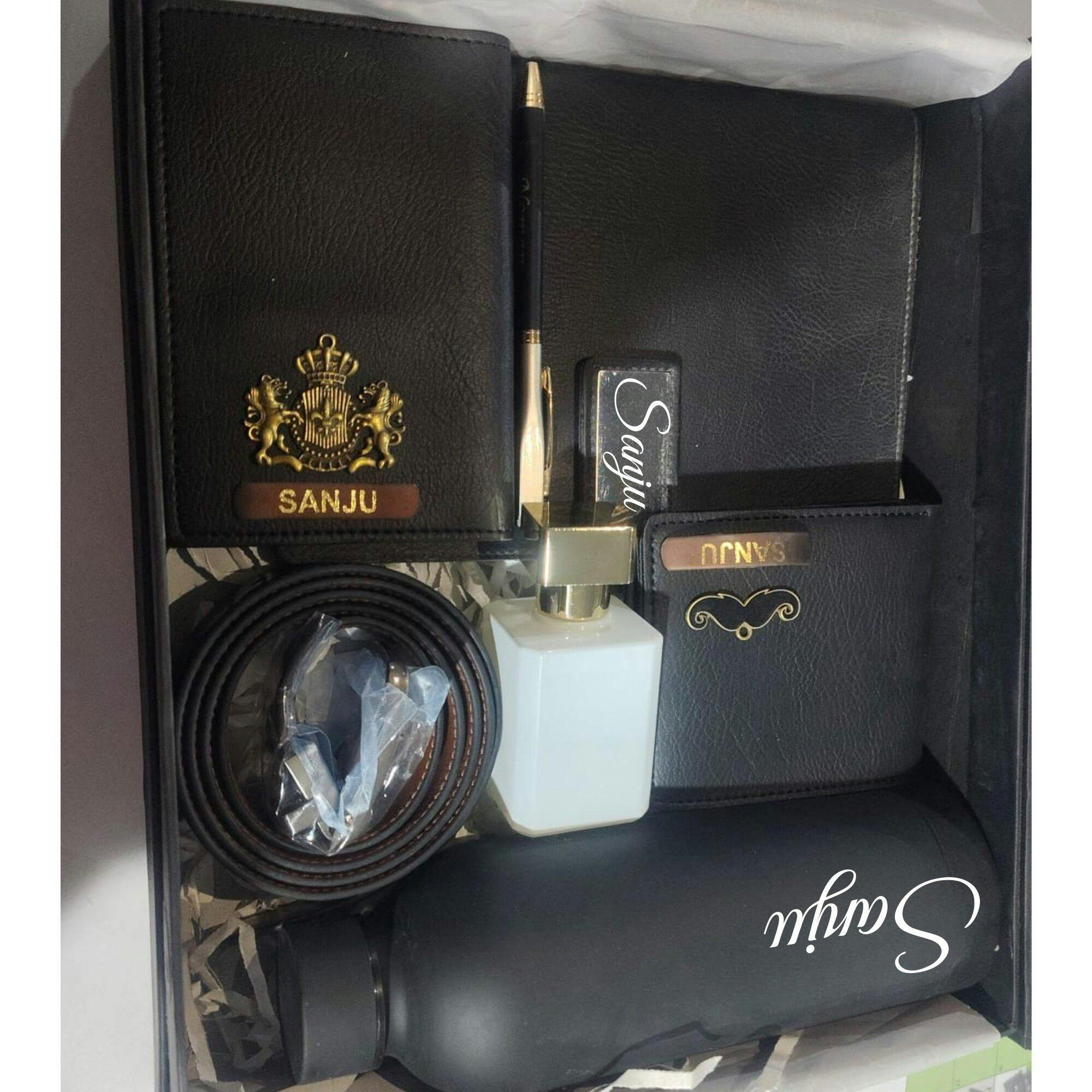 🎁 Personalized Leather 7-in-1 Combo – Wallet, Passport Cover, Diary, Pen, Perfume, Belt & H2GO Bottle with Golden Foil Name & Charm