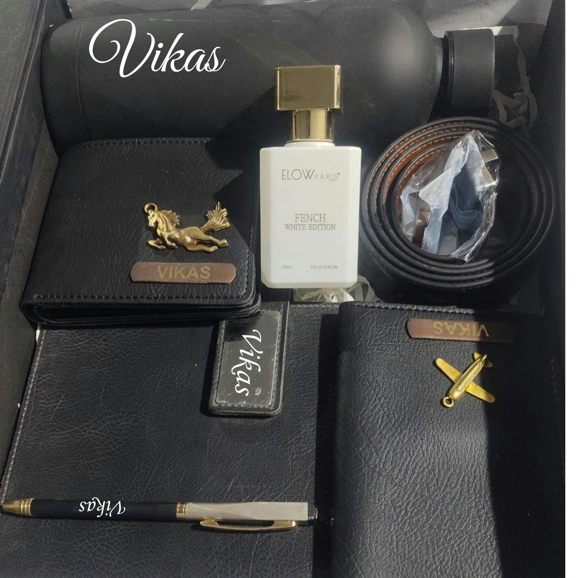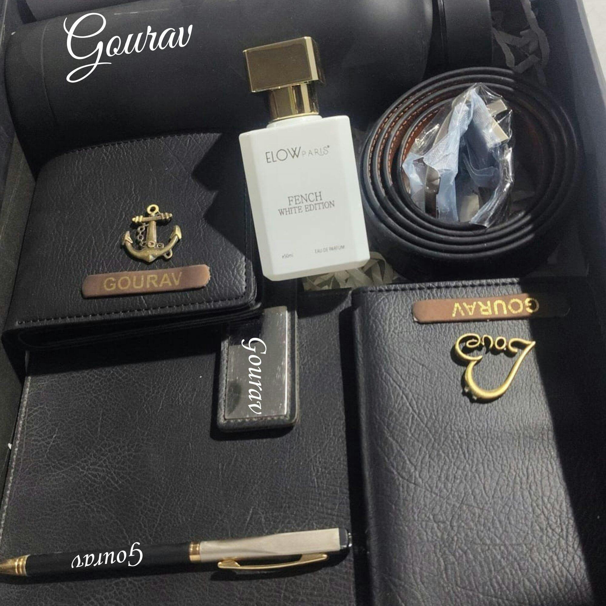 Make every celebration unforgettable with our Personalized Leather 7-in-1 Combo, a thoughtfully curated set for men who value style, functionality, and personalization. This luxurious combo includes a men’s wallet, passport cover, diary, pen, perfume, belt, and H2GO bottle, each featuring a golden foil name on a leather strip and an elegant charm—turning everyday essentials into meaningful keepsakes.