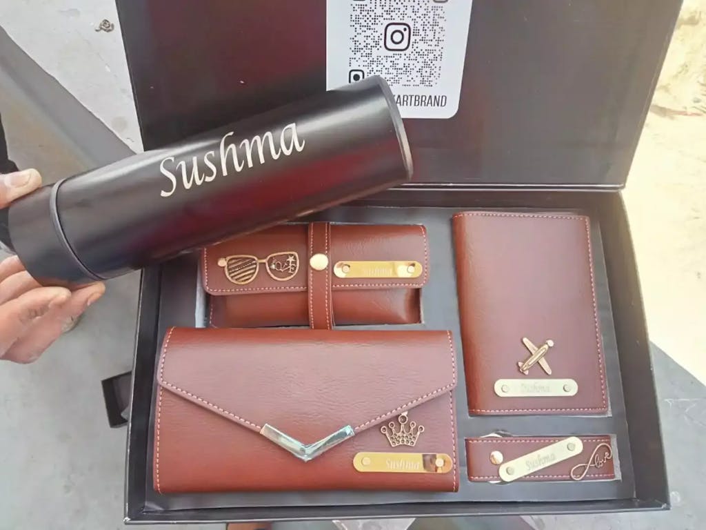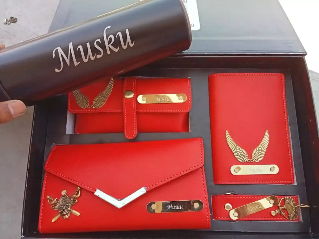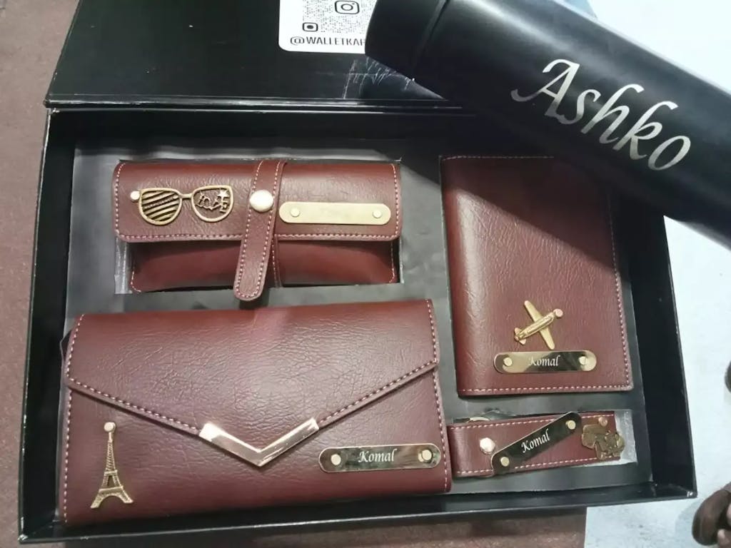 🌟 This premium combo includes a Customized clutch, keychain, passport cover, eyewear case, and water bottle – all beautifully personalized with her name or initials. Crafted for style and utility, this set makes a perfect gift for birthdays, travel lovers, or any special occasion.