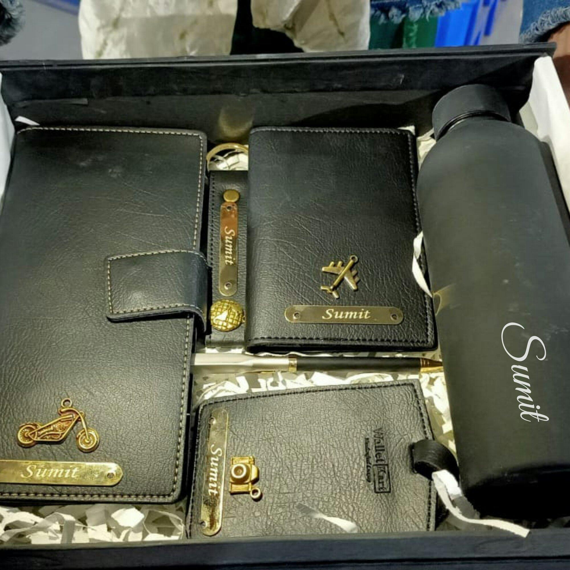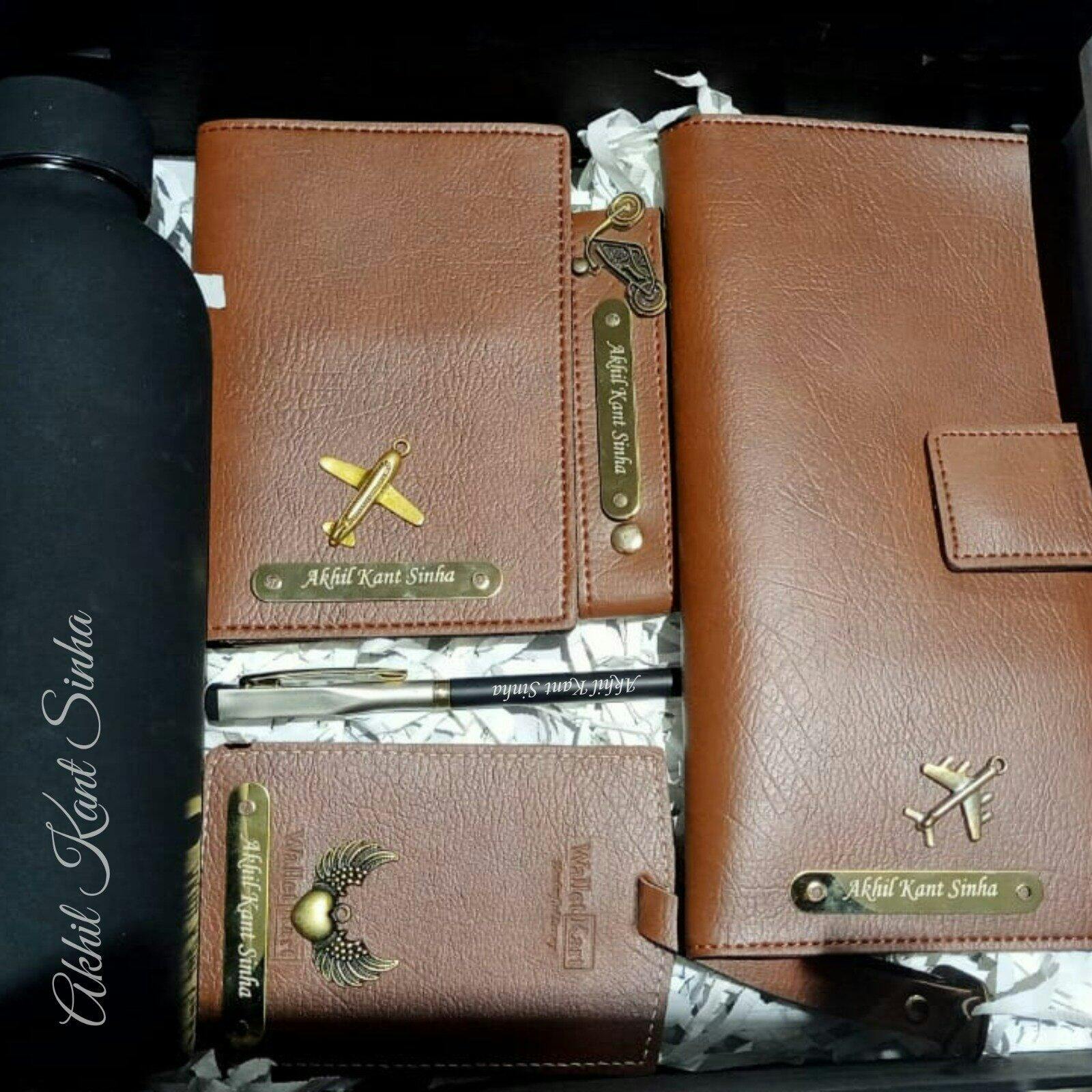 Crafted from high-quality genuine leather and premium materials, the card holder and travel wallet organize cash, cards, and documents in style, the luggage tag ensures easy identification, the pen adds a refined touch, the keychain combines durability with elegance, and the H2GO bottle keeps beverages hot or cold on the go. This combo perfectly balances functionality, sophistication, and personalization.