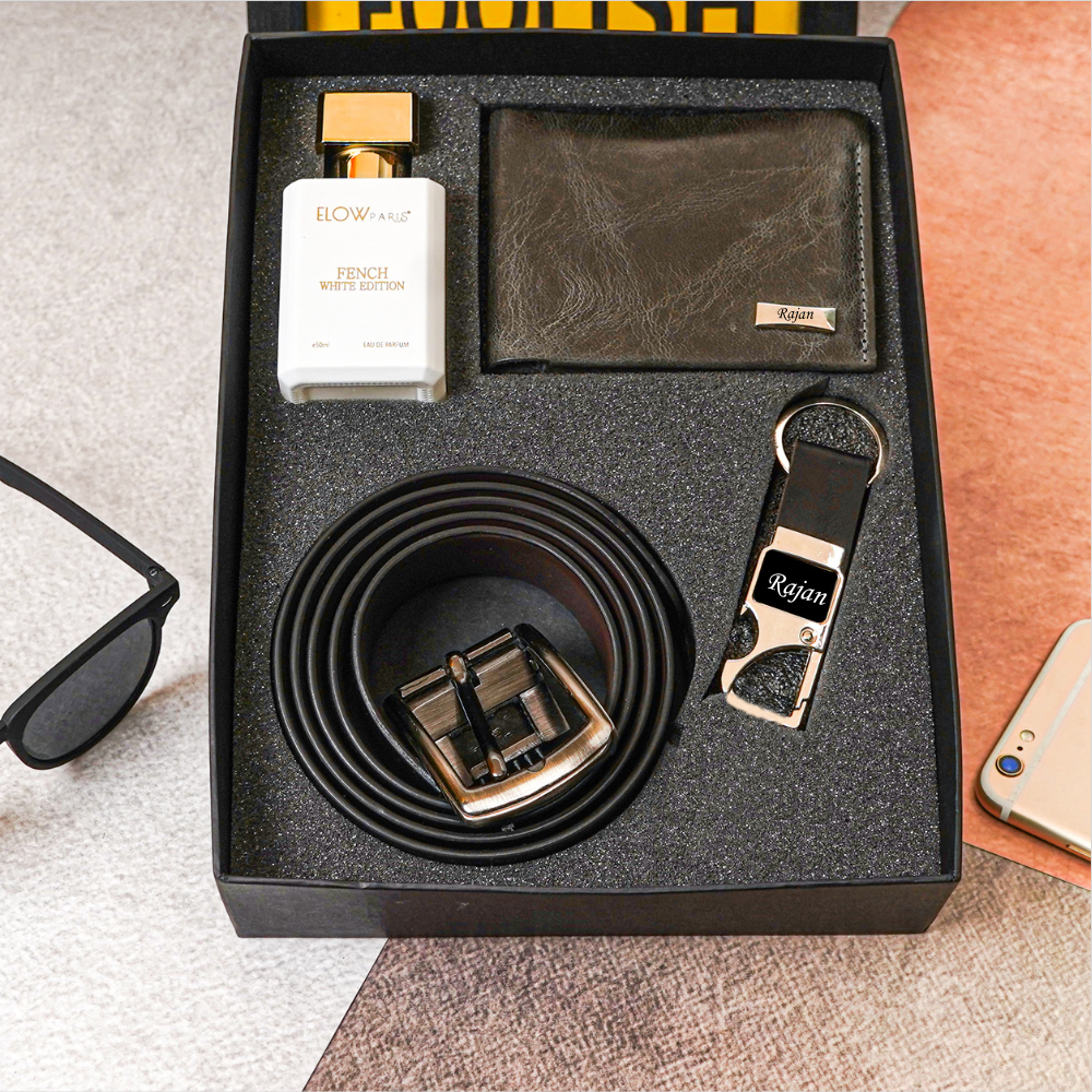 Best Leather Handcrafted Name Wallet, Belt & Parfume & Keychain (4 IN 1 Combo) Best Gift Option for Anniversary, Birthday, Valentine Day, Wedding, etc.