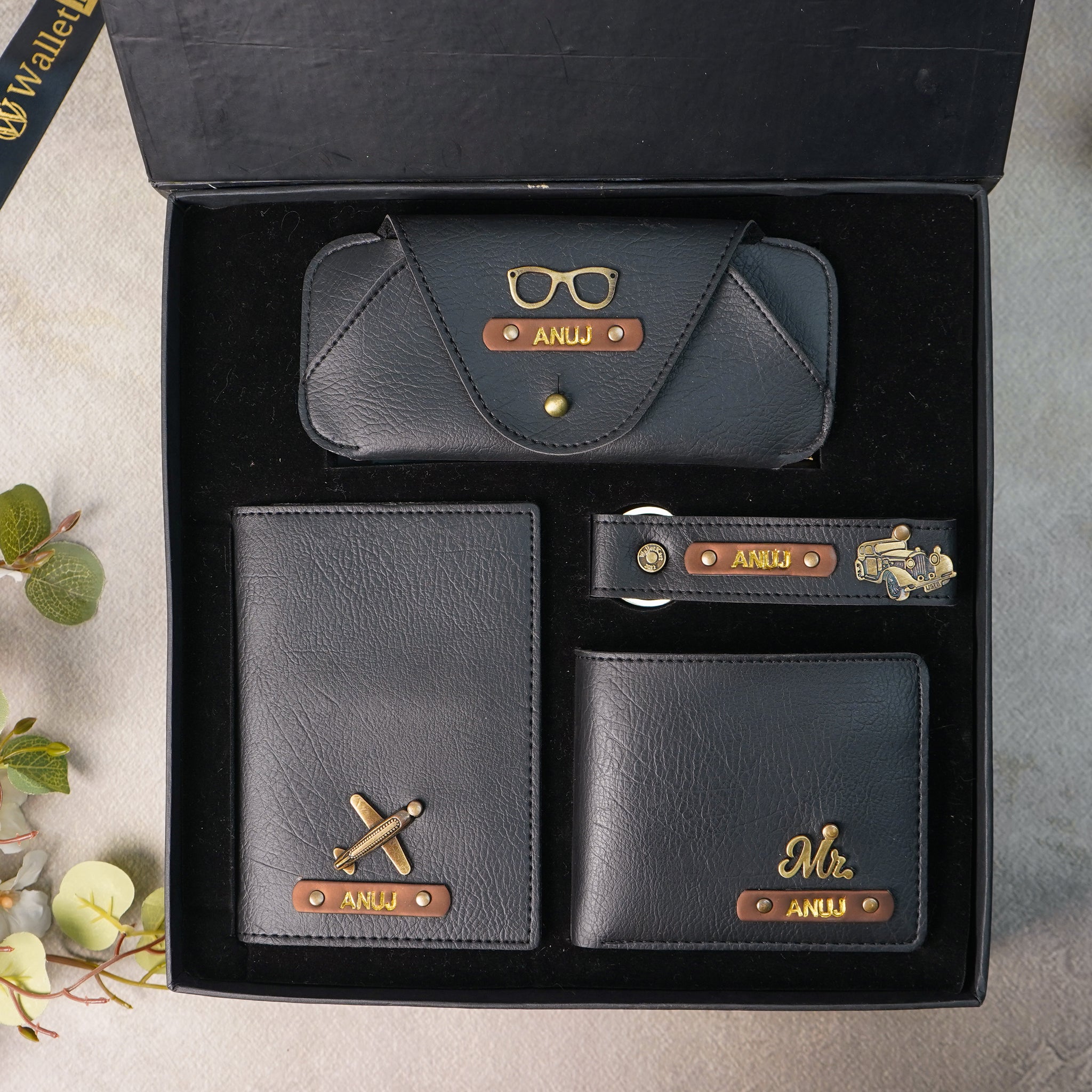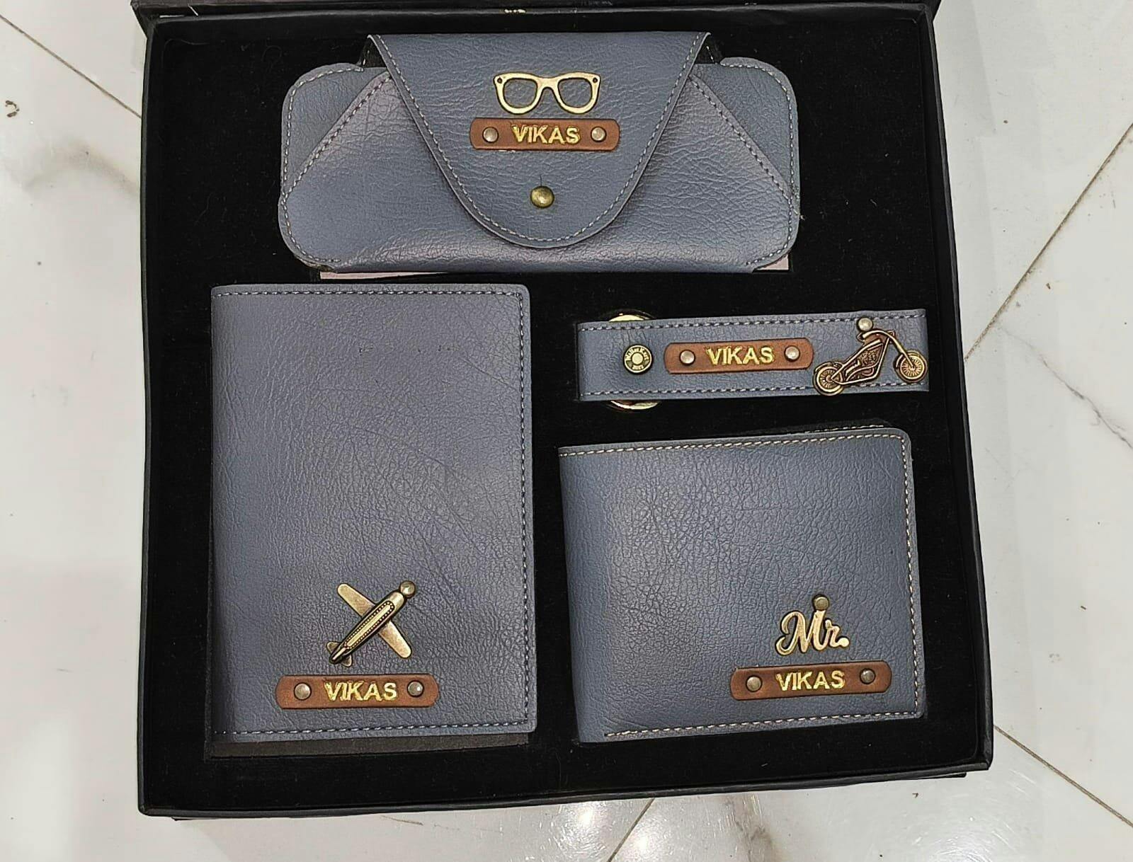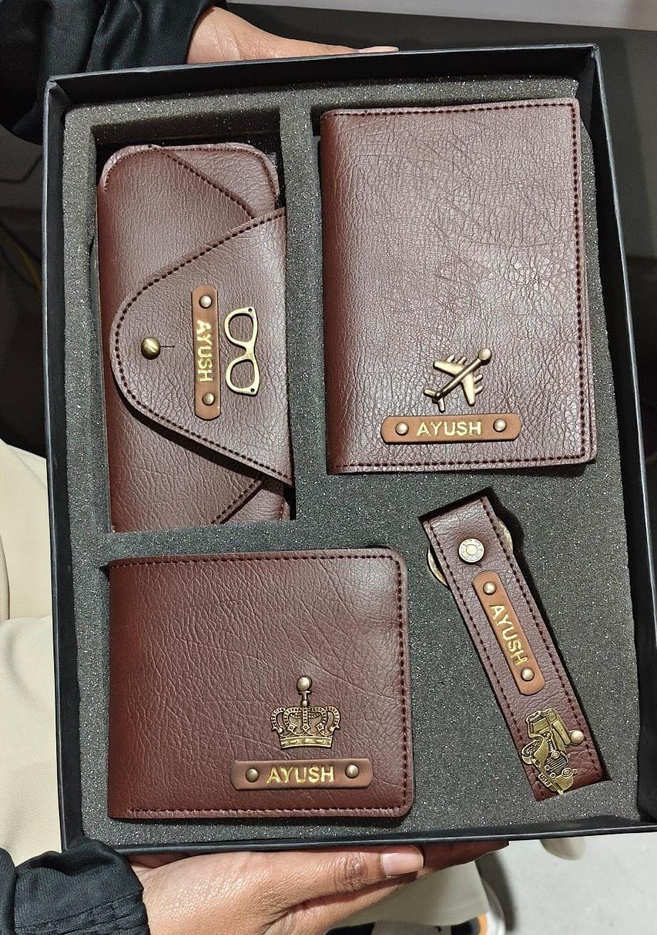 🎁 Personalized Leather 4-in-1 Combo – Men’s Wallet, Eyewear Case, Passport Cover & Keychain with Golden Foil Name & Charm
