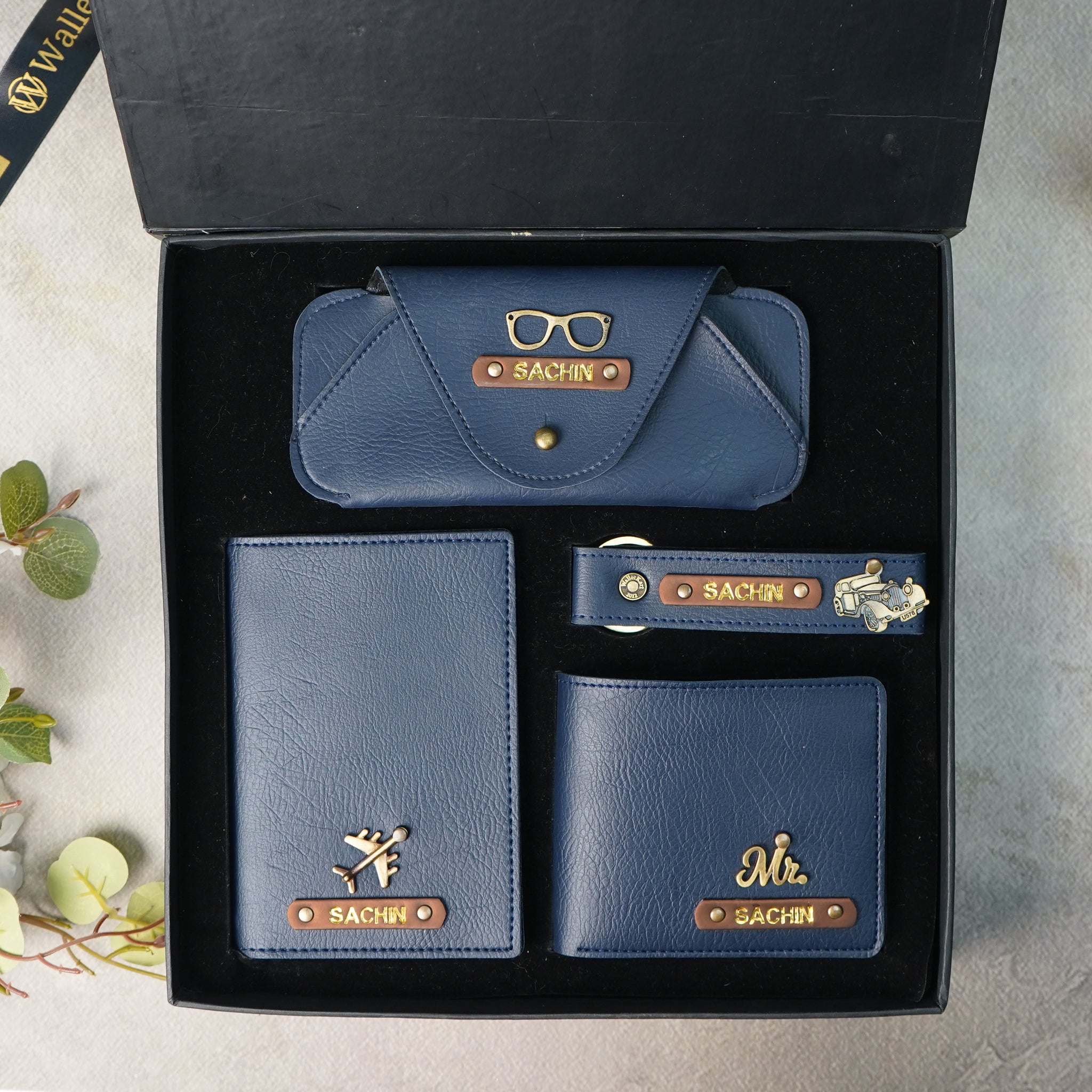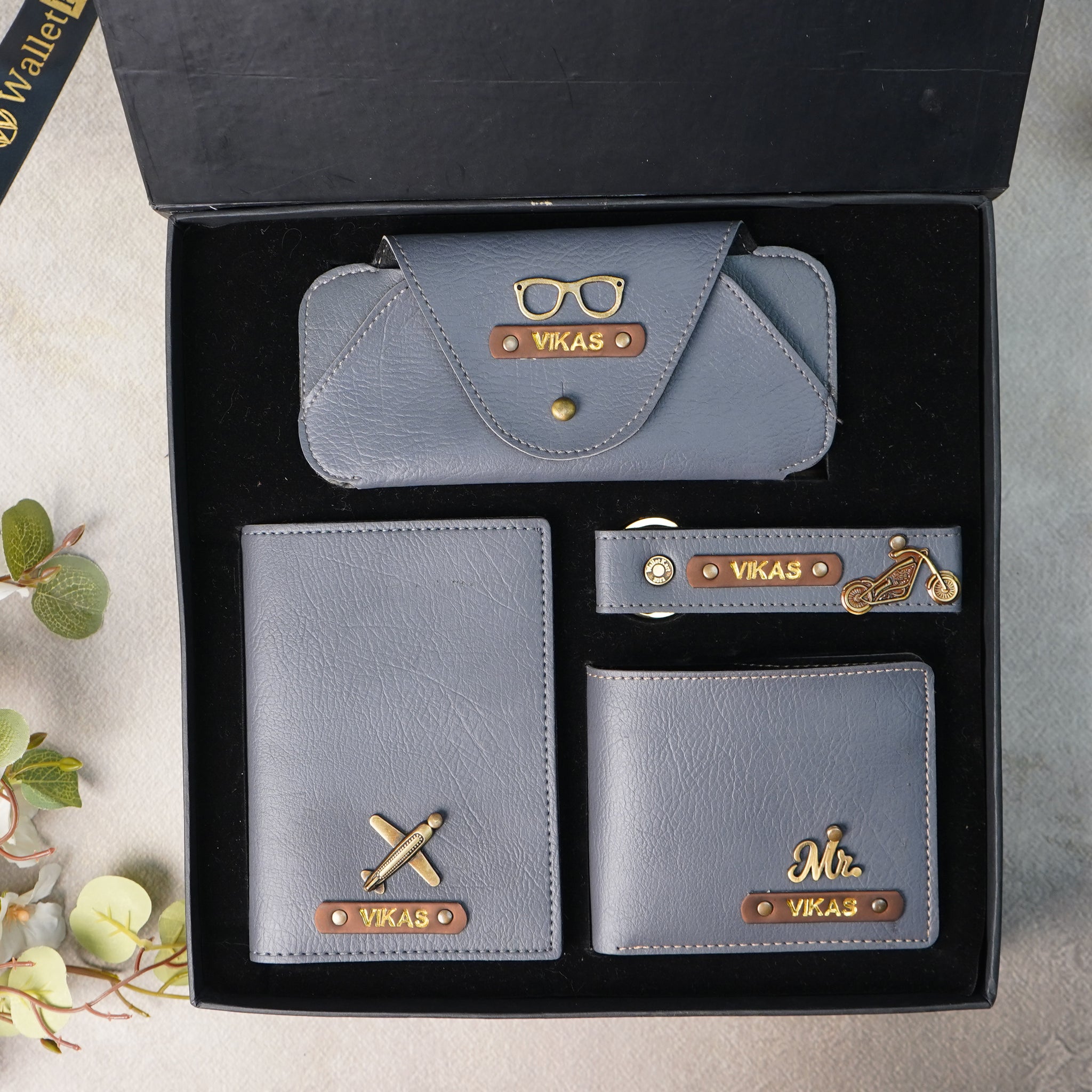 Make gifting memorable with our Personalized Leather 4-in-1 Combo, thoughtfully designed for men who value style, utility, and personalization. This luxurious set includes a men’s wallet, eyewear case, passport cover, and keychain, each featuring a golden foil name on a leather strip with an elegant charm—turning everyday essentials into sophisticated keepsakes.