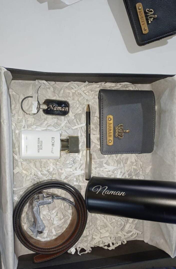 Celebrate his special moments with a that reflects style, utility, and personalization. Our Personalized Leather 6-in-1 Combo is thoughtfully curated for modern men, featuring a men’s wallet, belt, metal keychain, pen, perfume, and temperature bottle, all enhanced with an embossed leather strip engraved with his name and a stylish charm for a truly touch.
