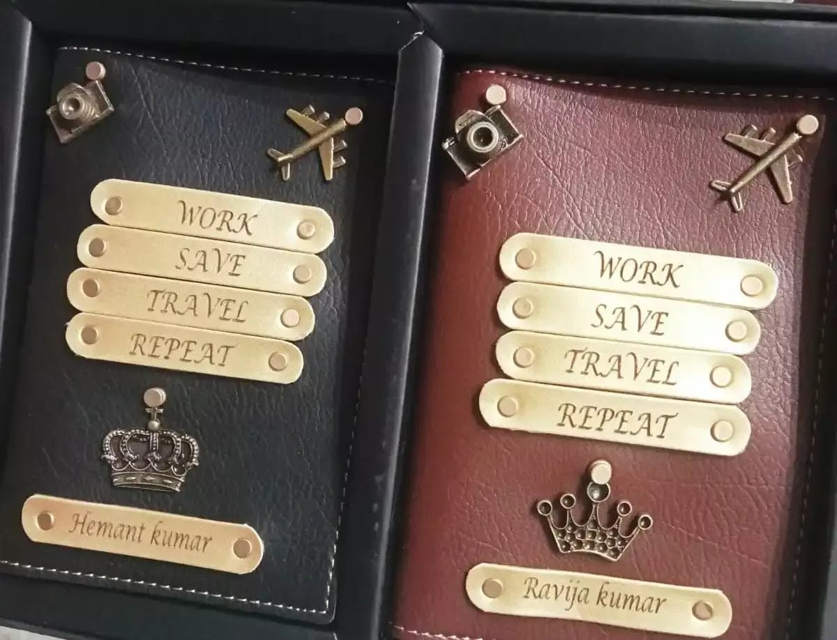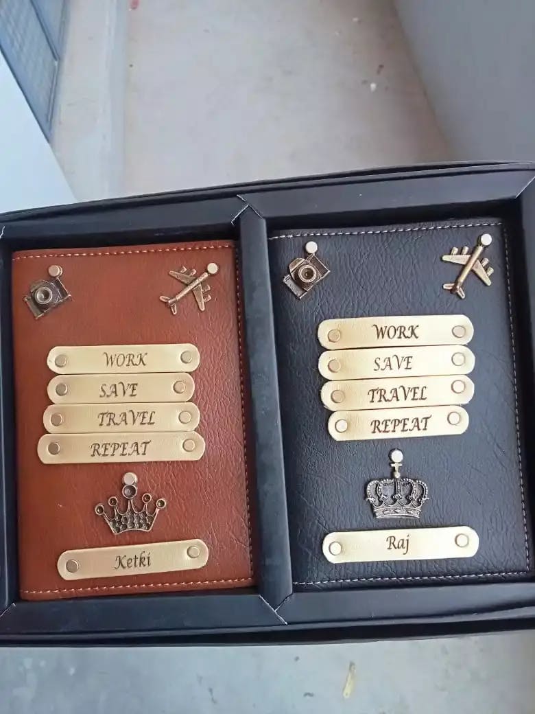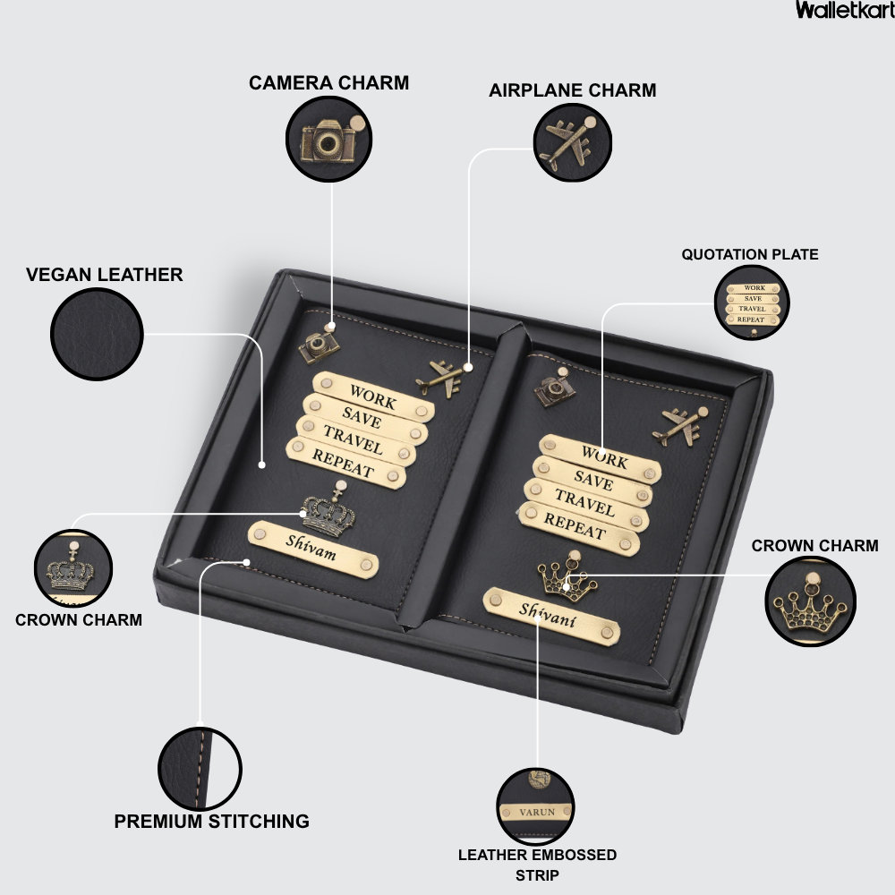Customised Special Gift for Traveller by Walletkart - Passport Cover Couple Combo With Name & Charm (WORK SAVE TRAVEL REPEAT).