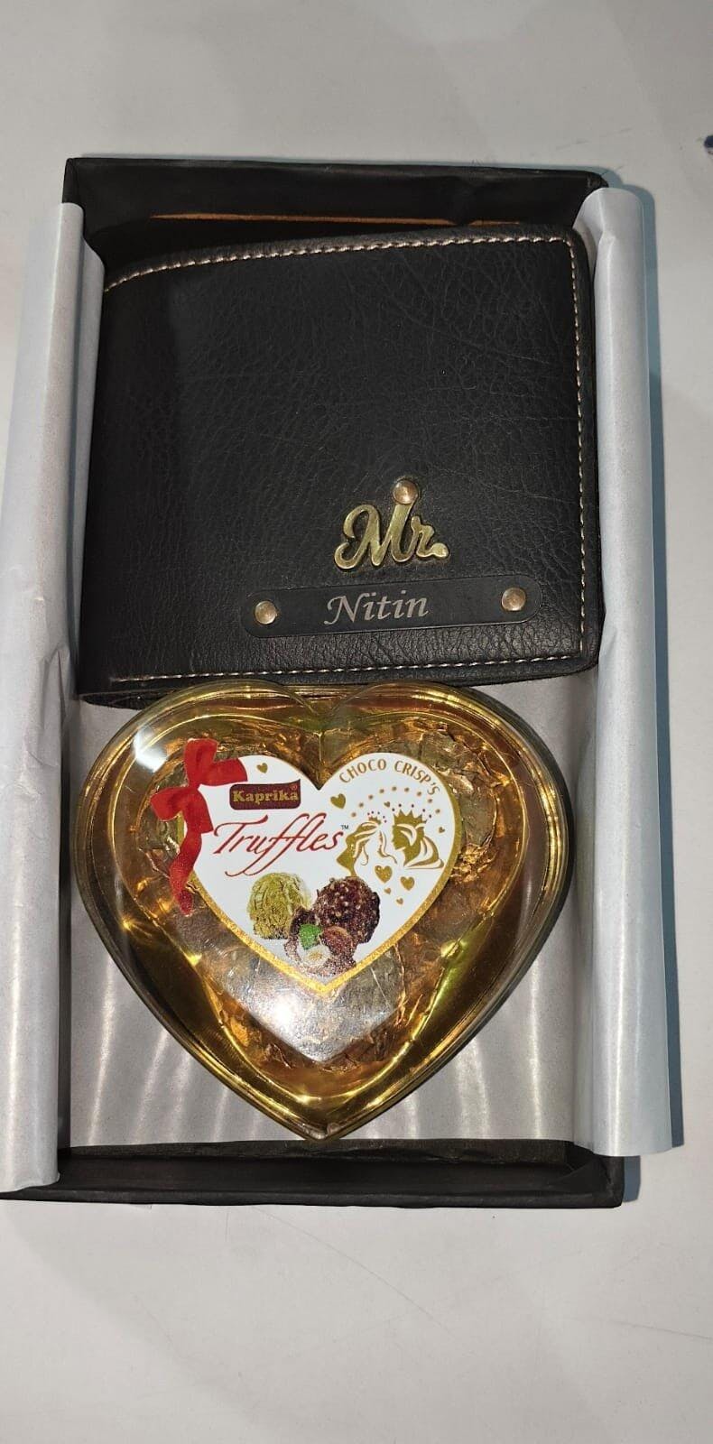🎁 Personalized Leather 2-in-1 Gift Combo – Men’s Wallet & Chocolate with Black Name Plate & Charm