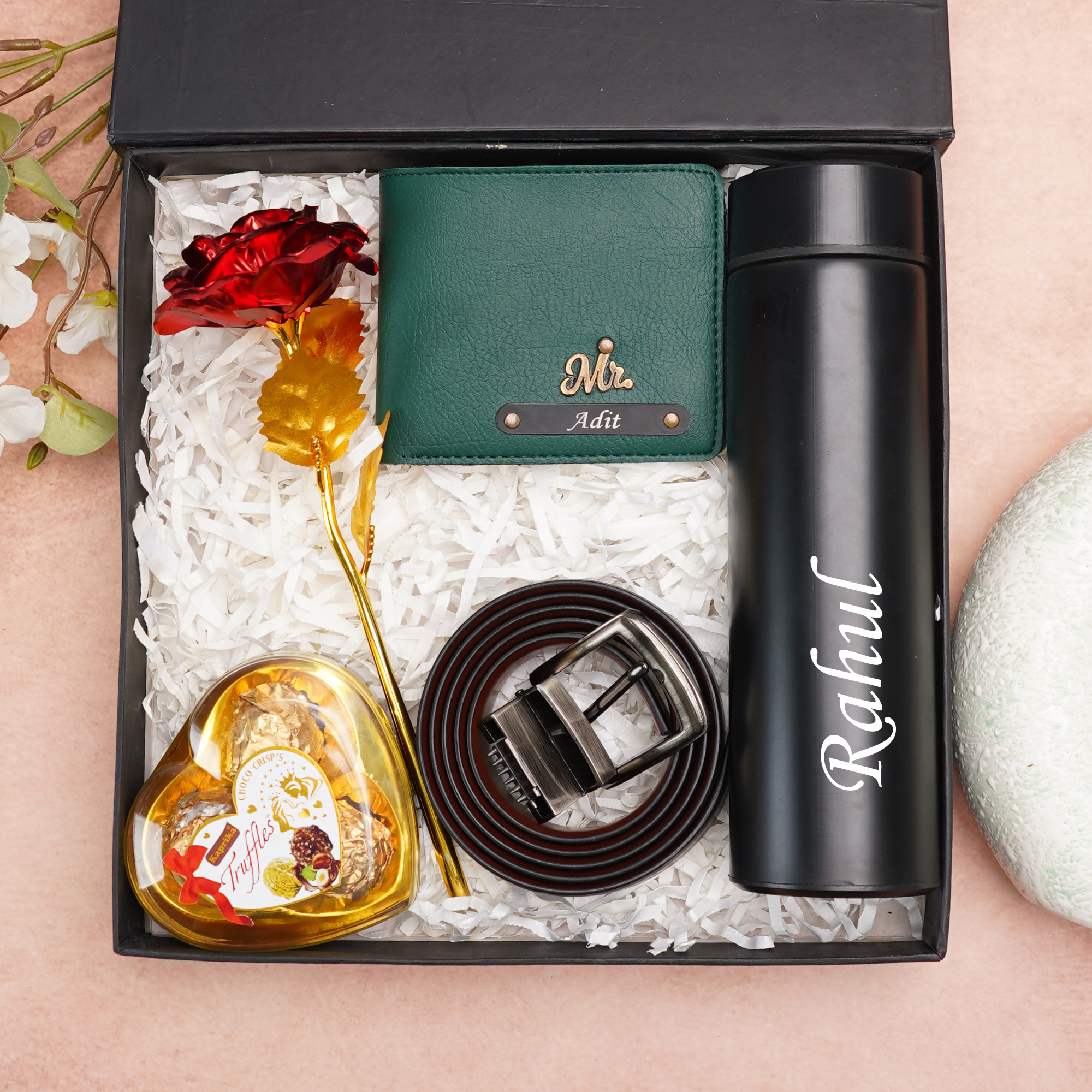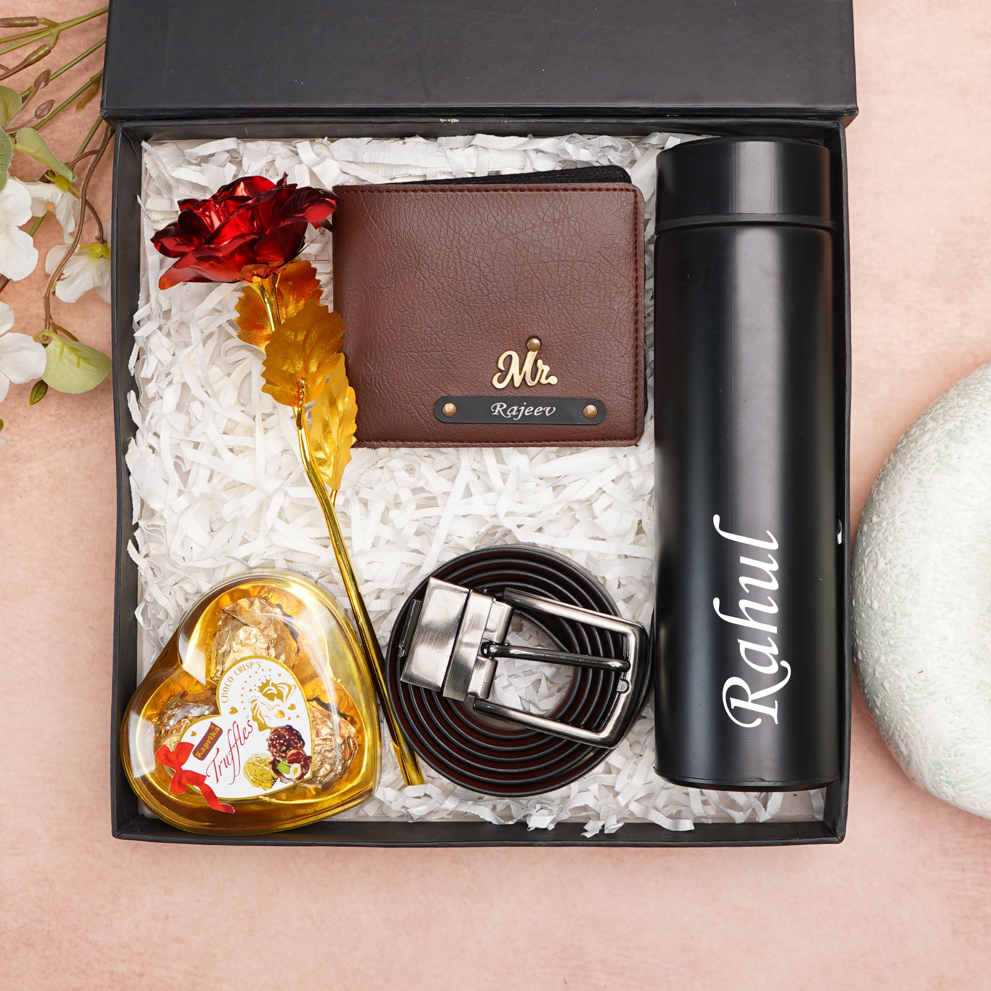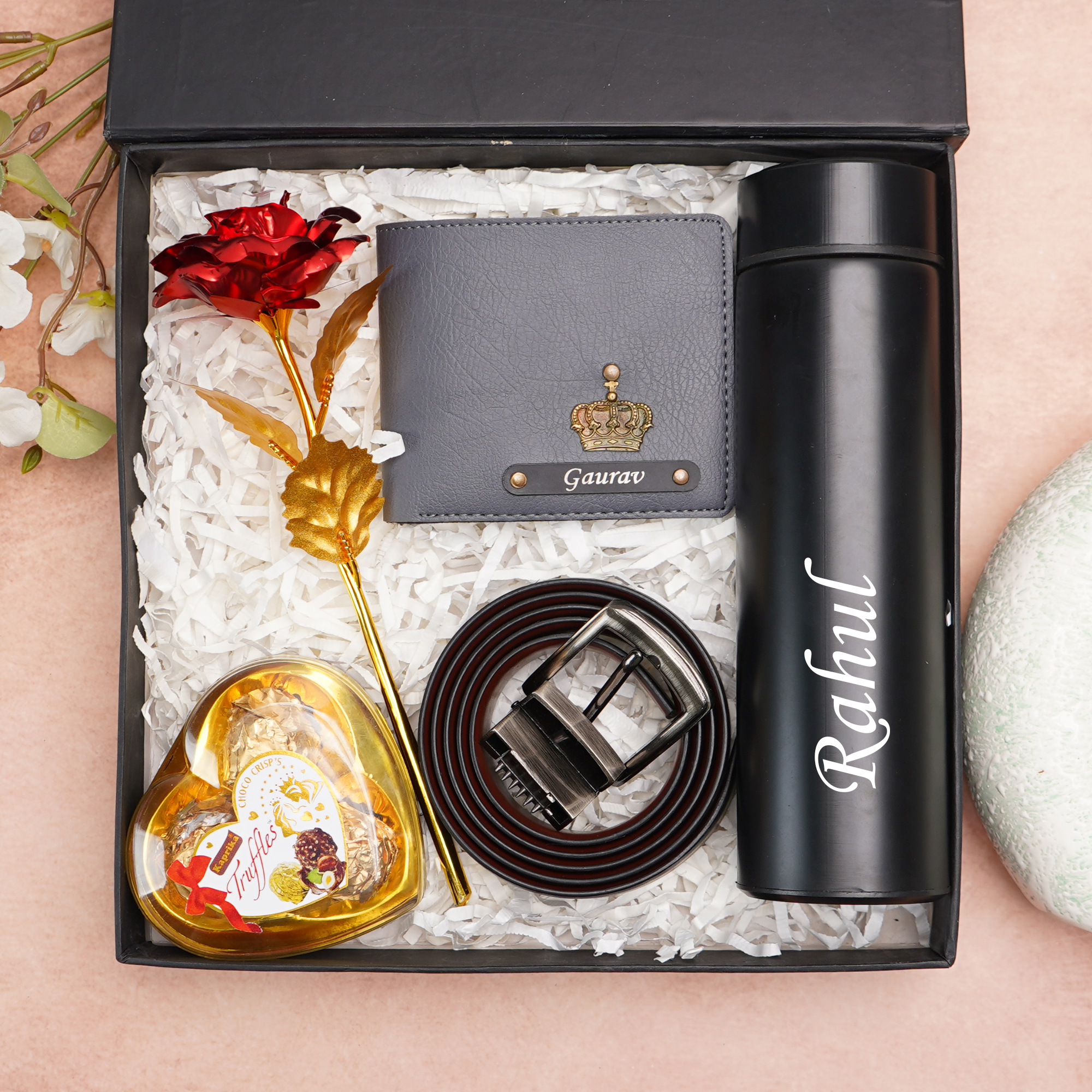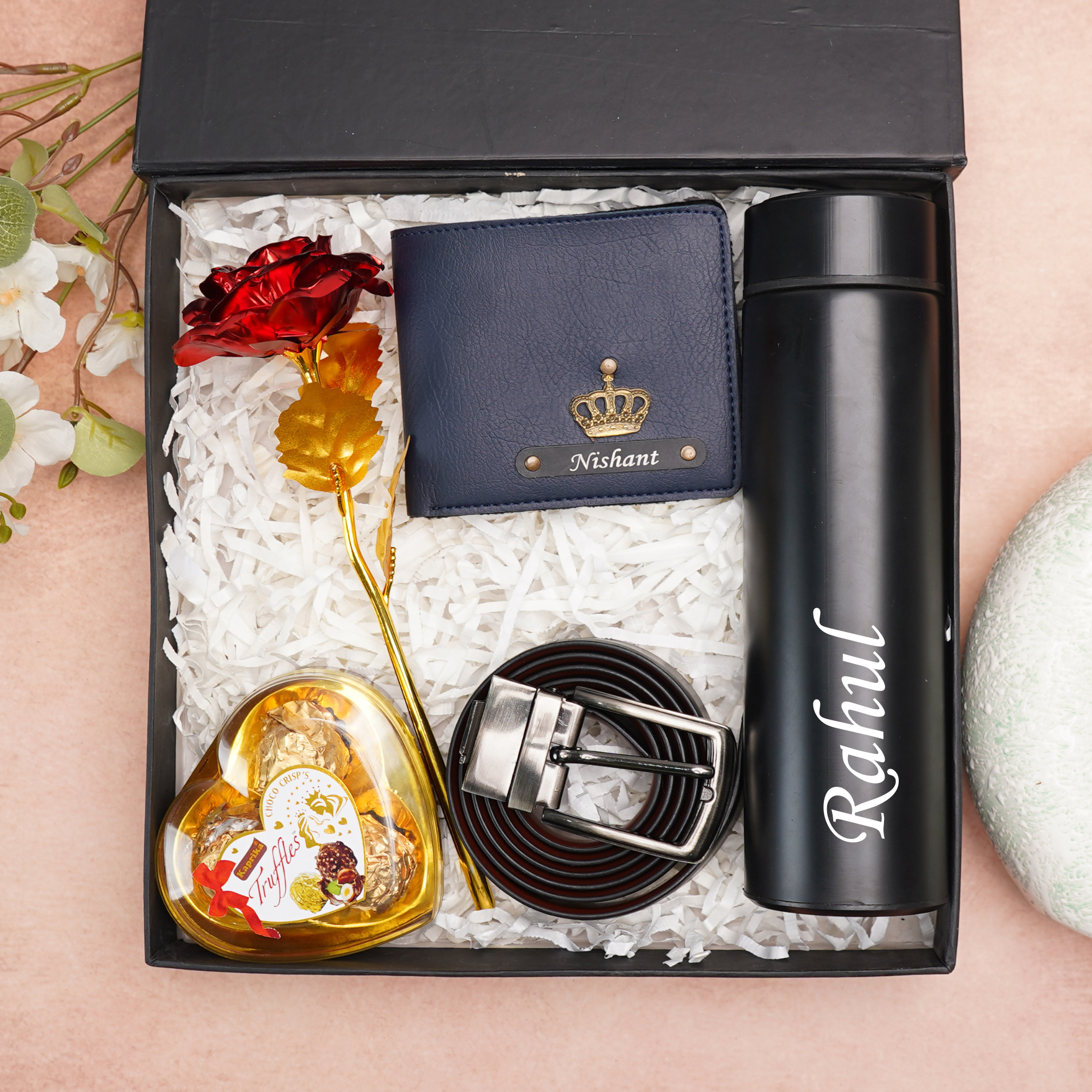 Crafted from high-quality genuine leather and premium materials, the wallet and belt bring timeless sophistication to everyday wear, while the temperature bottle keeps beverages hot or cold for hours. The addition of a rose and chocolate adds a heartfelt romantic touch, making this combo perfect for love-filled occasions. The sleek black engraved name plate enhances the modern, premium appeal of the gift.