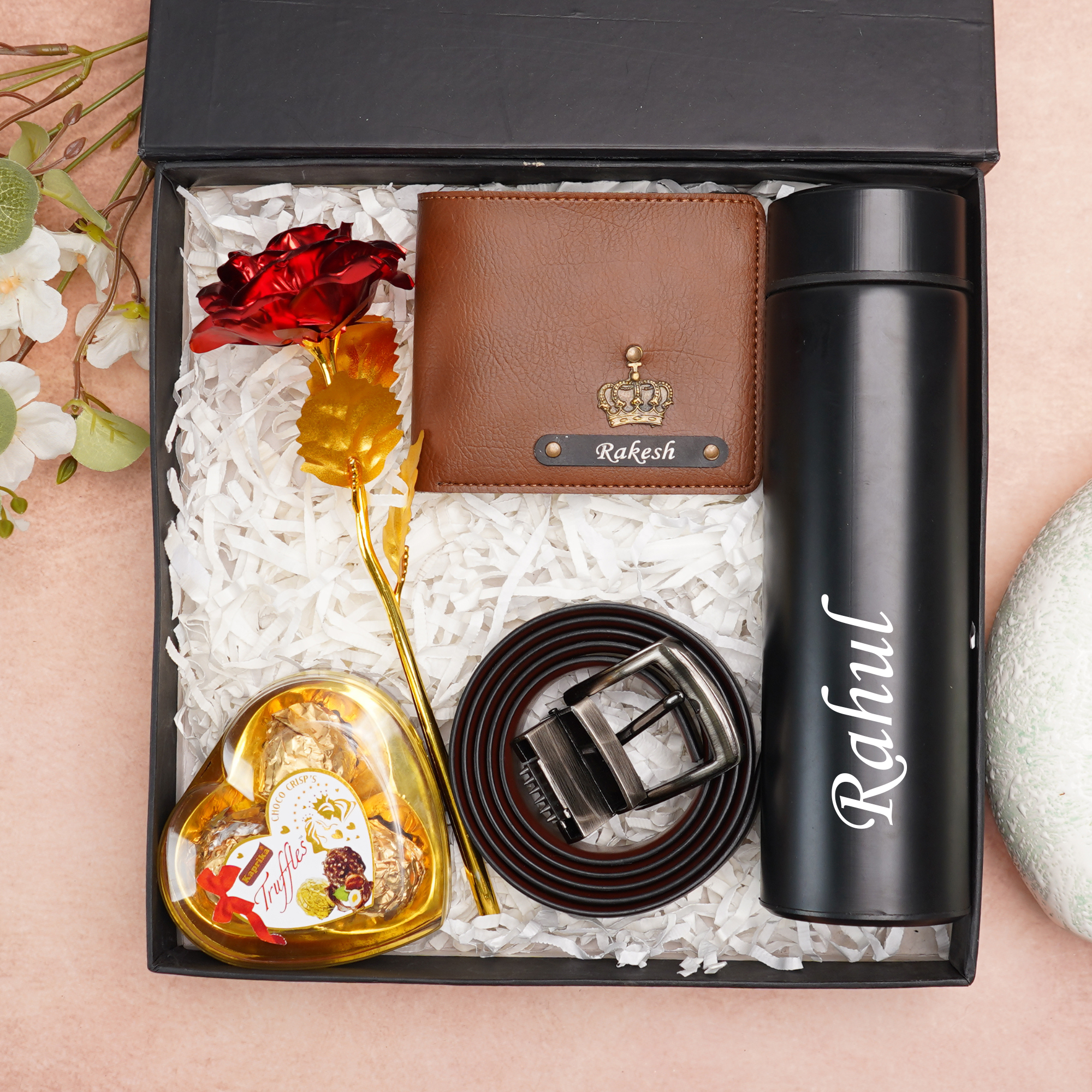 🎁 Personalized Leather 5-in-1 Gift Combo – Men’s Wallet, Belt, Rose, Chocolate & Temperature Bottle with Black Name Plate & Charm