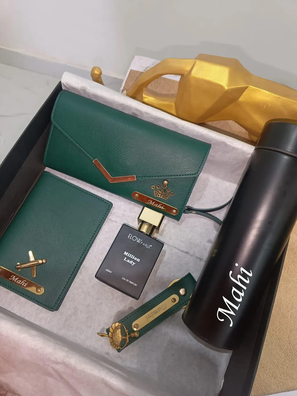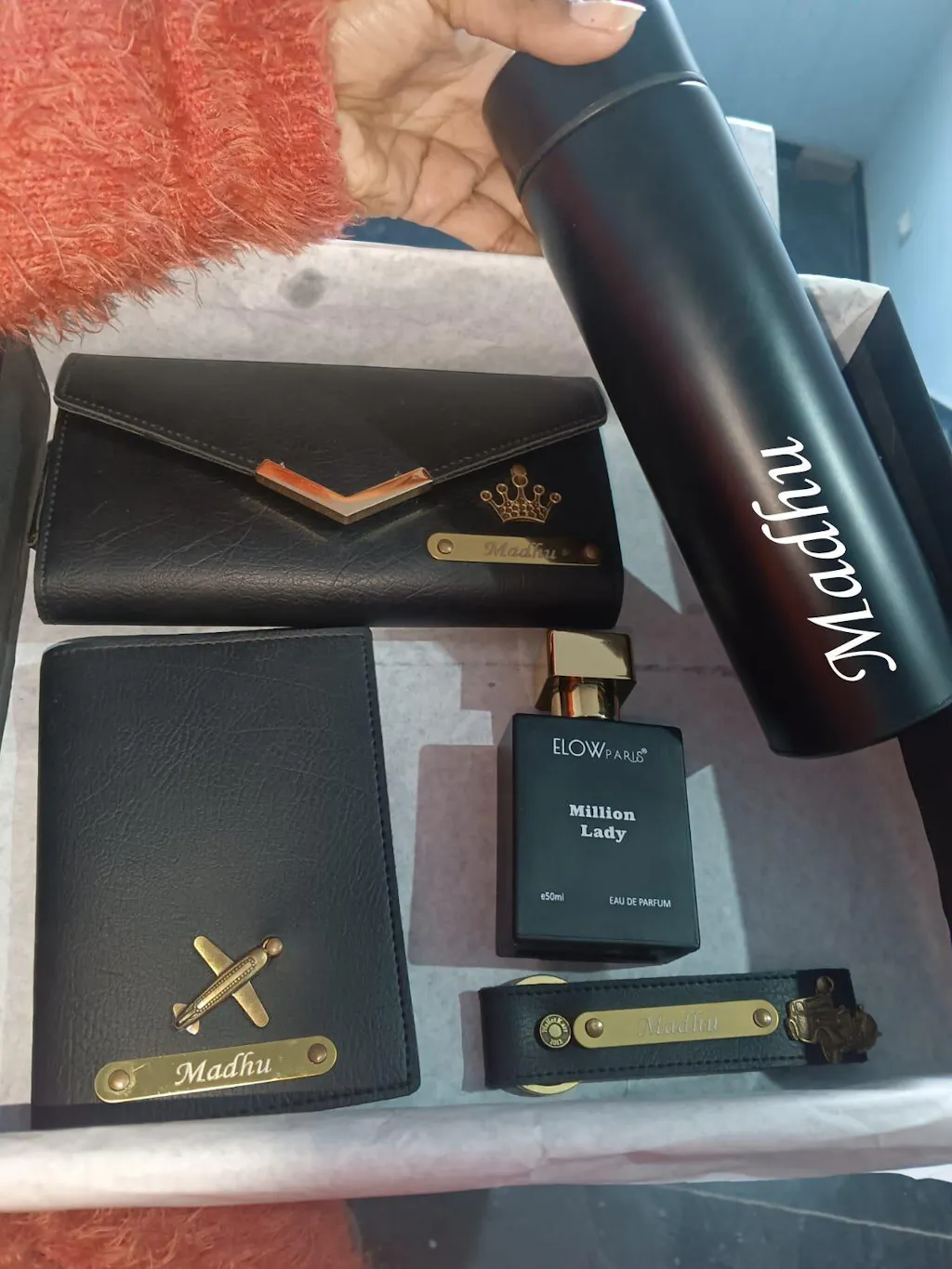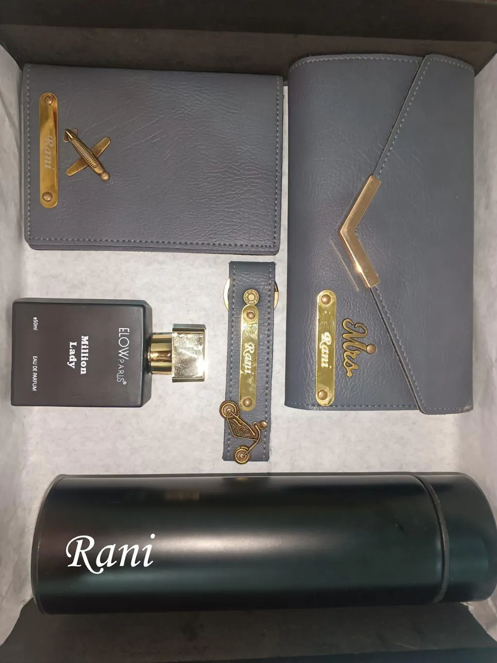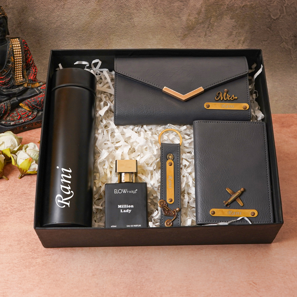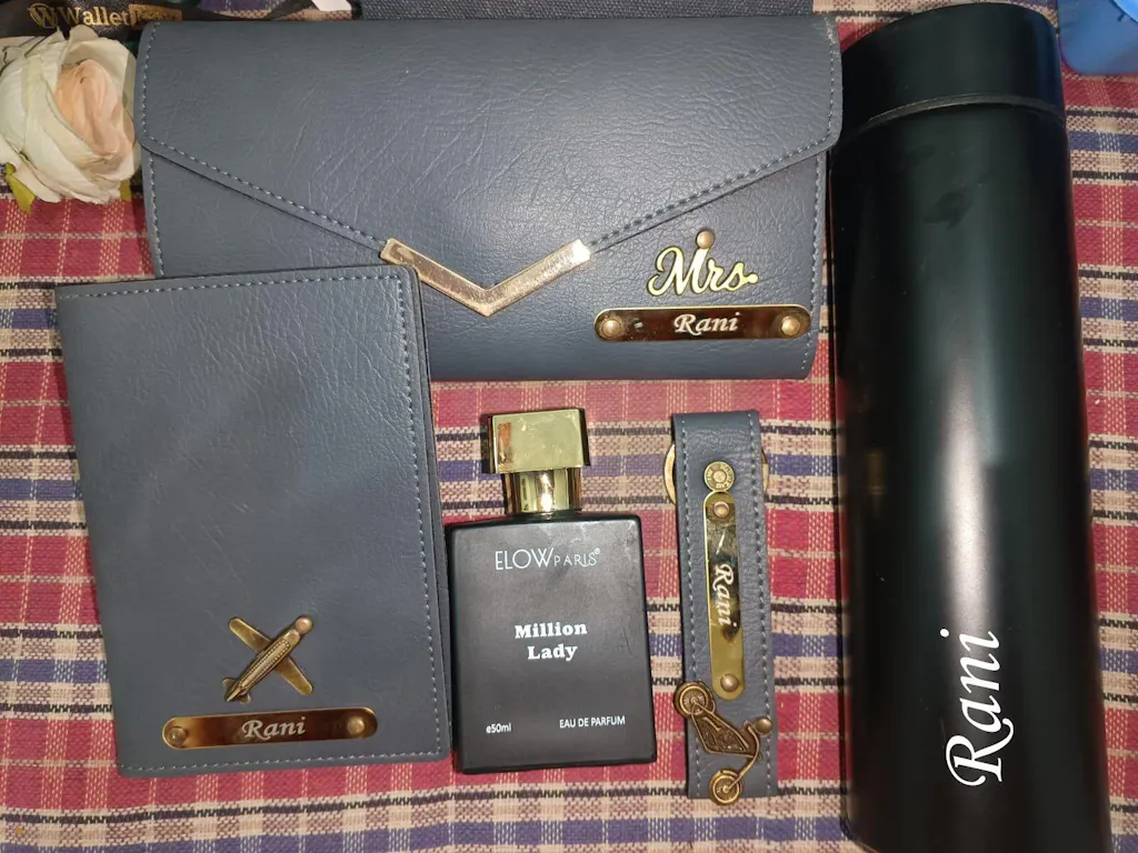 🌟 This premium combo includes a Customized clutch, keychain, passport cover, Parfume, and water bottle – all beautifully personalized with her name or initials. Crafted for style and utility, this set makes a perfect gift for birthdays, travel lovers, or any special occasion.