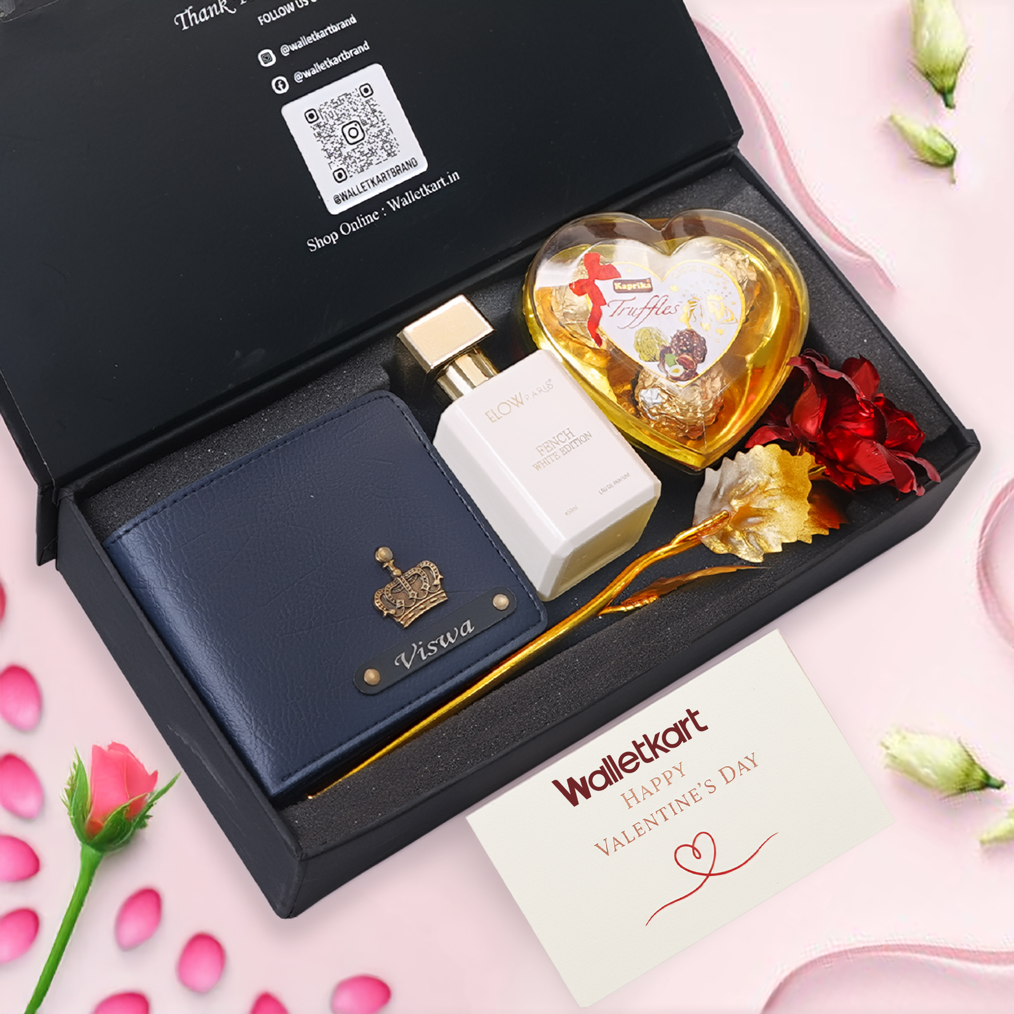 Surprise your Boyfriend or Husband with a Romantic Gift Set that speaks from the heart — a stylish Wallet for his everyday confidence, a premium Perfume for lasting impressions, a beautiful Red Rose to express your love, and sweet Chocolates to celebrate your special bond.